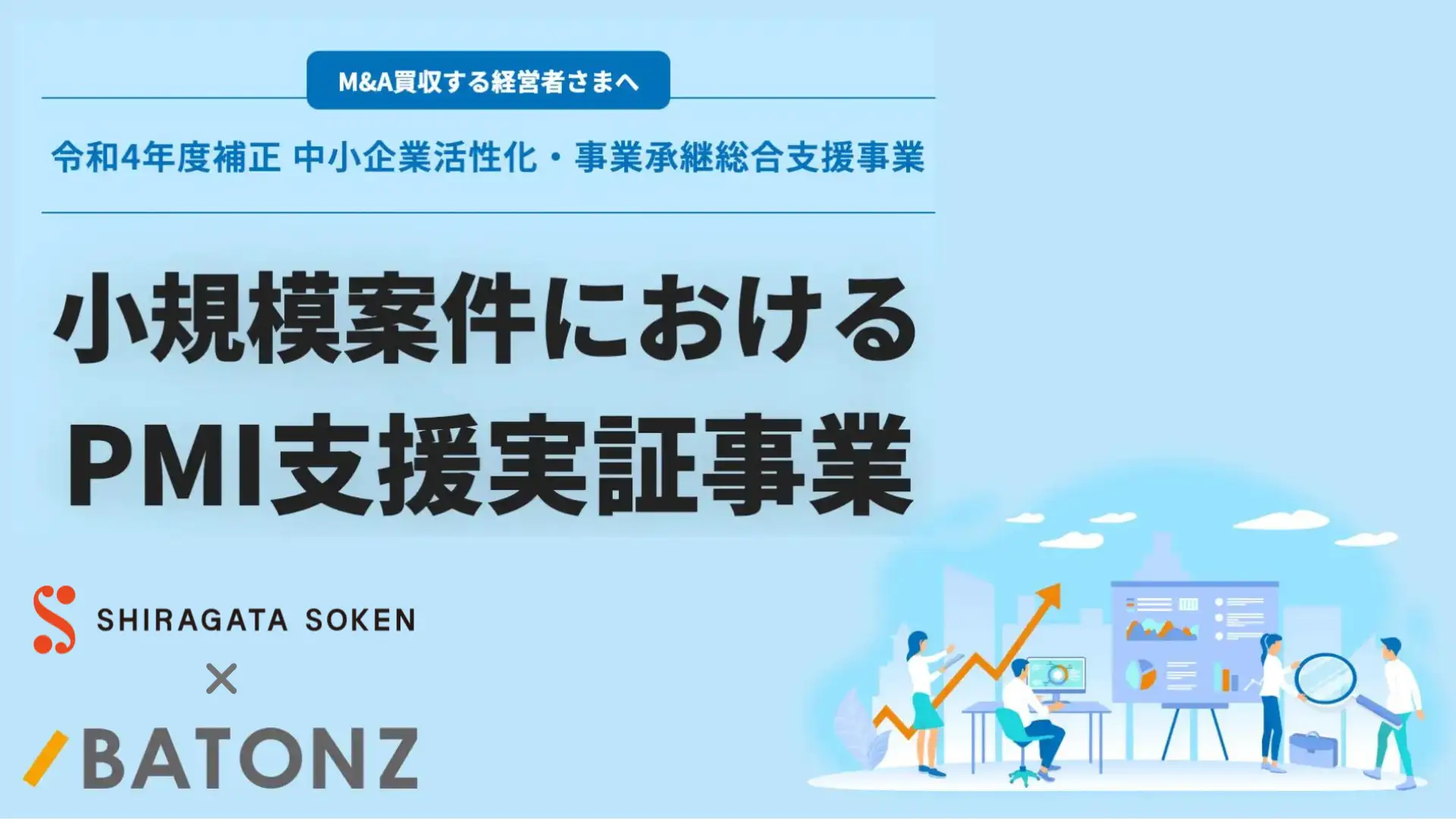 白潟総研グループは、「令和4年度補正中小企業活性化・事業承継総合支援事業(小規模案件におけるPMI支援実証事業)」の実施機関として採択を受けた株式会社バトンズと協業し、M&Aの譲受側を対象として中小企業M&A におけるプレPMI・PMI 支援の型化と普及に向けた実証事業を開始しますので、お知らせします。