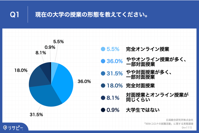 「Q1.現在の大学の授業の形態を教えてください。」(n=111)の調査では、以下のような結果となっています。