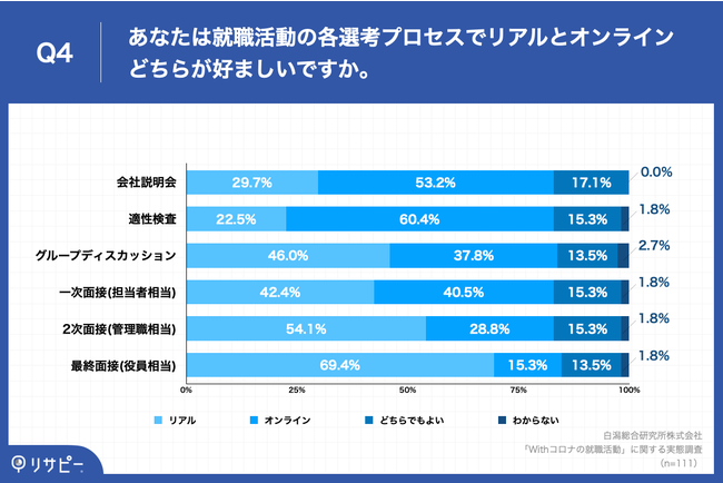 「Q4.あなたは就職活動の各選考プロセスでリアルとオンラインどちらが好ましいですか。」(n=111)という調査では、以下のような結果となりました。