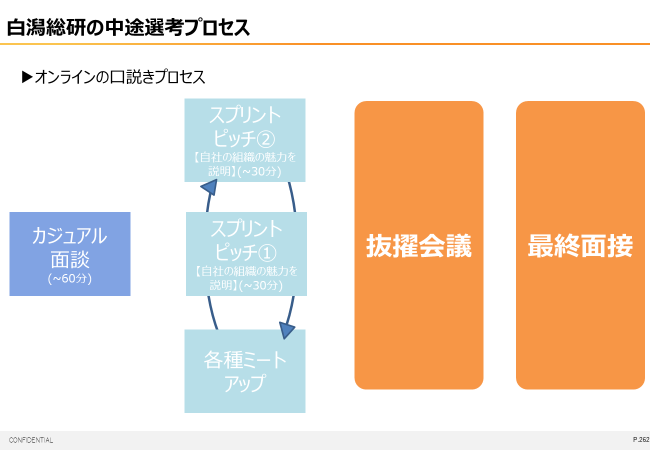 これが白潟総研の第二新卒の選考フローです。(中途でも同じです)